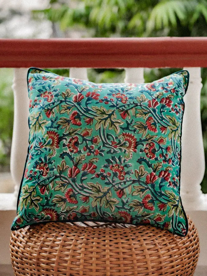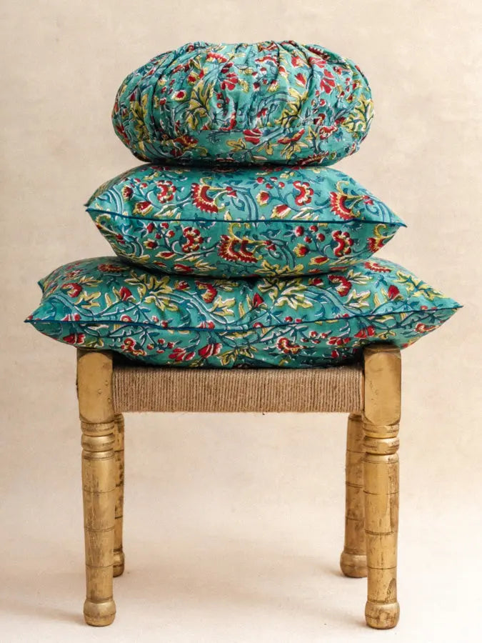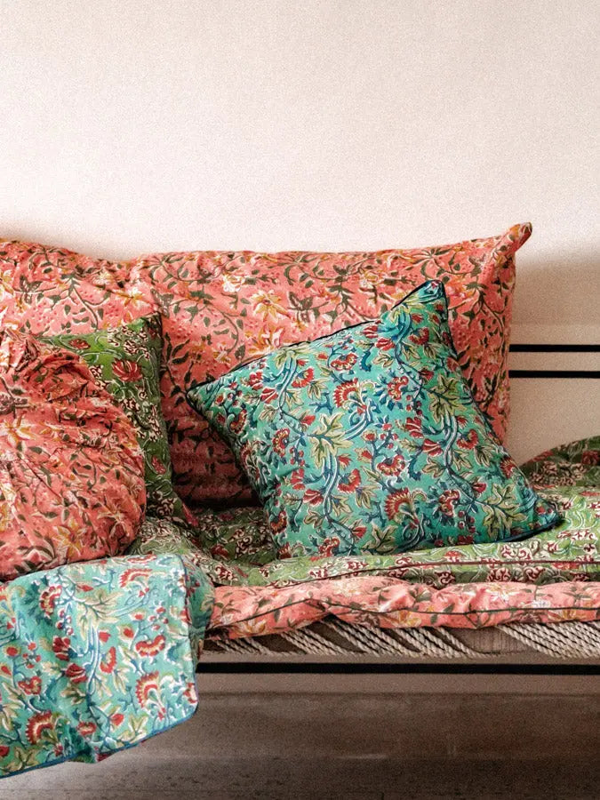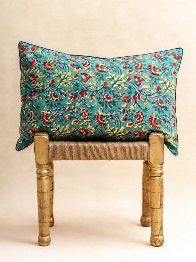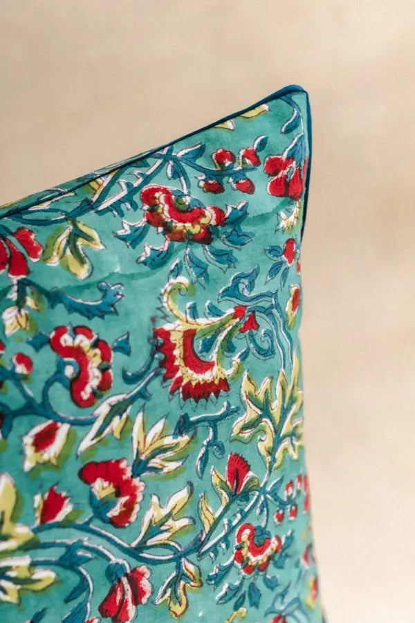 Made from organic cotton and hand-printed using the block-print technique, this cushion cover features a blue floral pattern with graphics inspired by Indian art. Its delicate and contemporary design brings a touch of timeless elegance, where artisanal authenticity meets modernity.