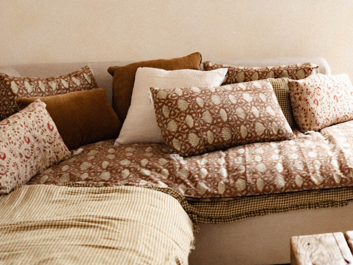 Discover our cotton sofa covers, ideal for embellishing your sofas and adding a touch of elegance to your interior. Handmade and block printed, our covers are removable and washable, allowing you to easily change them according to the seasons. These artisanal pieces, combining comfort and practicality, bring a unique touch to your furniture, while respecting our ethical commitments.
