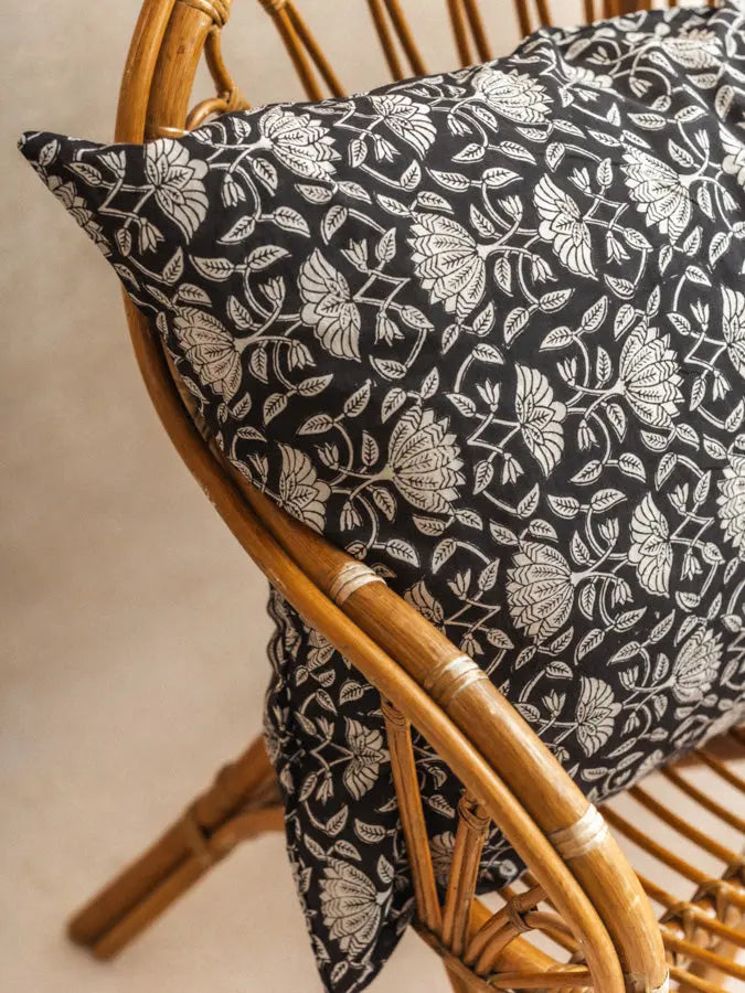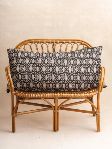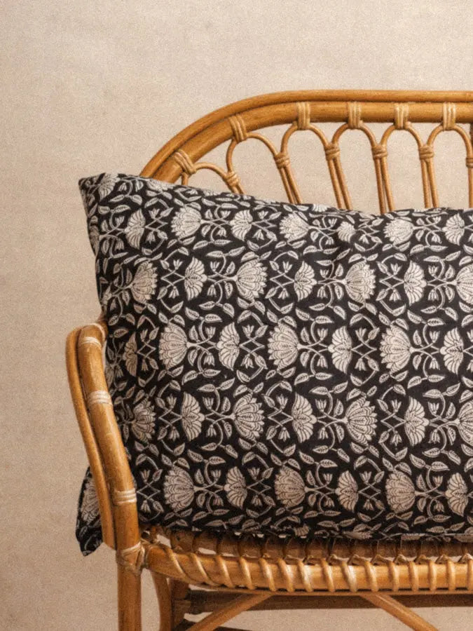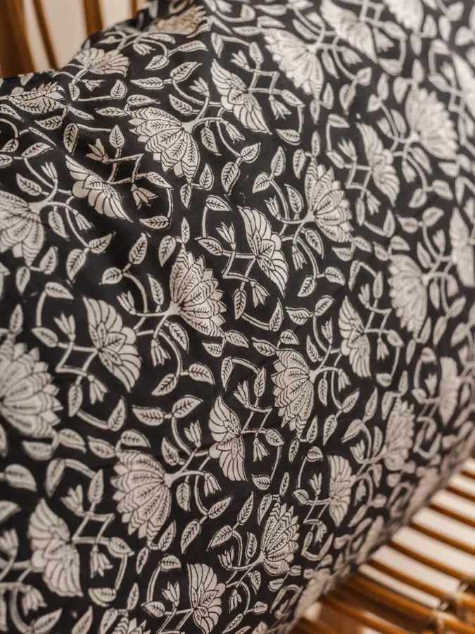 Bring a touch of artisanal elegance to your interior with the giant Lotus Noir cushion cover in XL format 110x55 cm, designed in 100% handmade organic cotton.