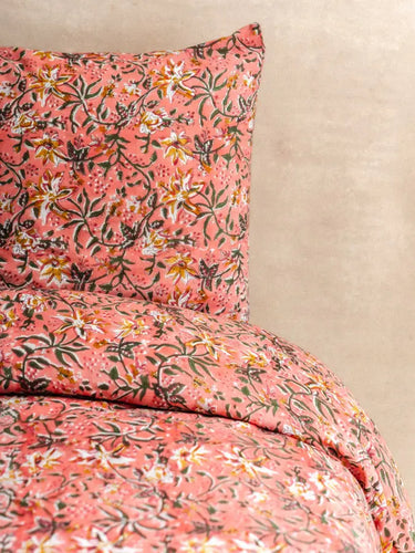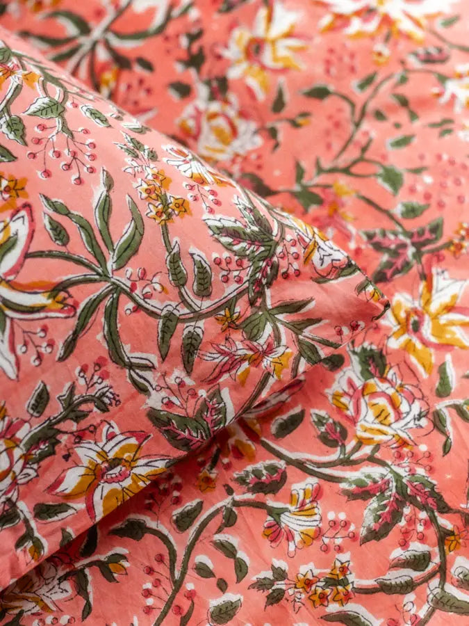Despite its fineness, cotton voile is renowned for its strength and durability, ensuring a long-lasting quality for your bed linen. Additionally, its lightness and breathable properties make it an ideal choice for peaceful and comfortable nights. Each piece features a hand-applied pattern using the traditional block printing technique, adding a unique, artisanal touch to your home.