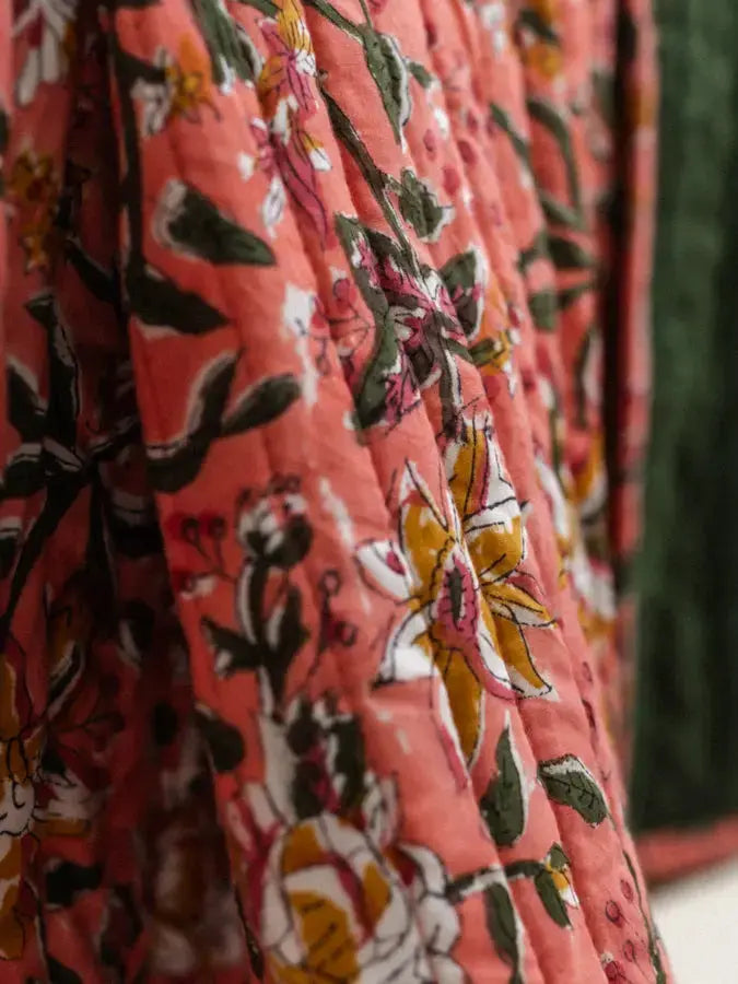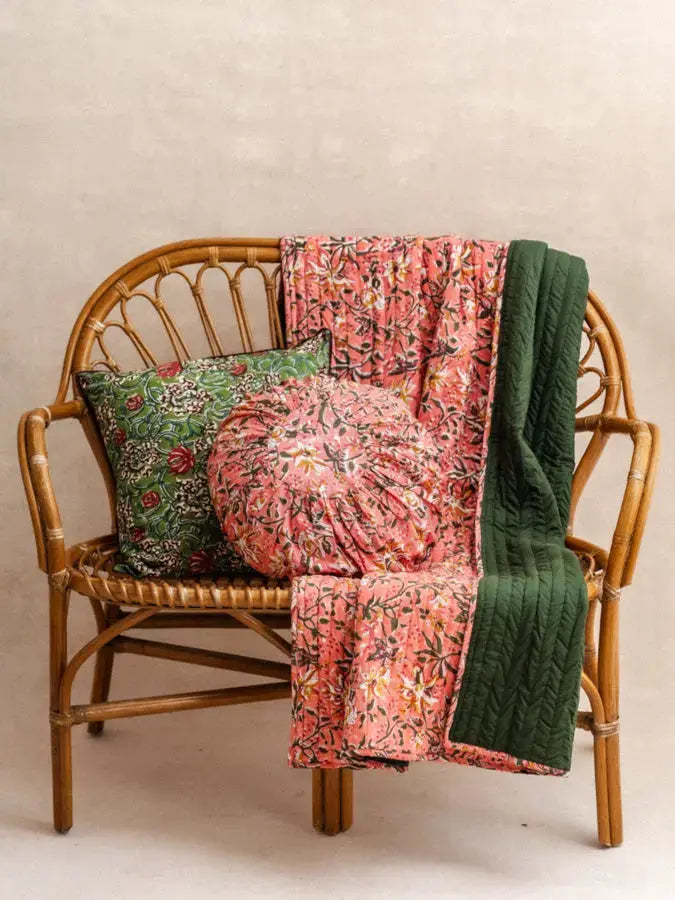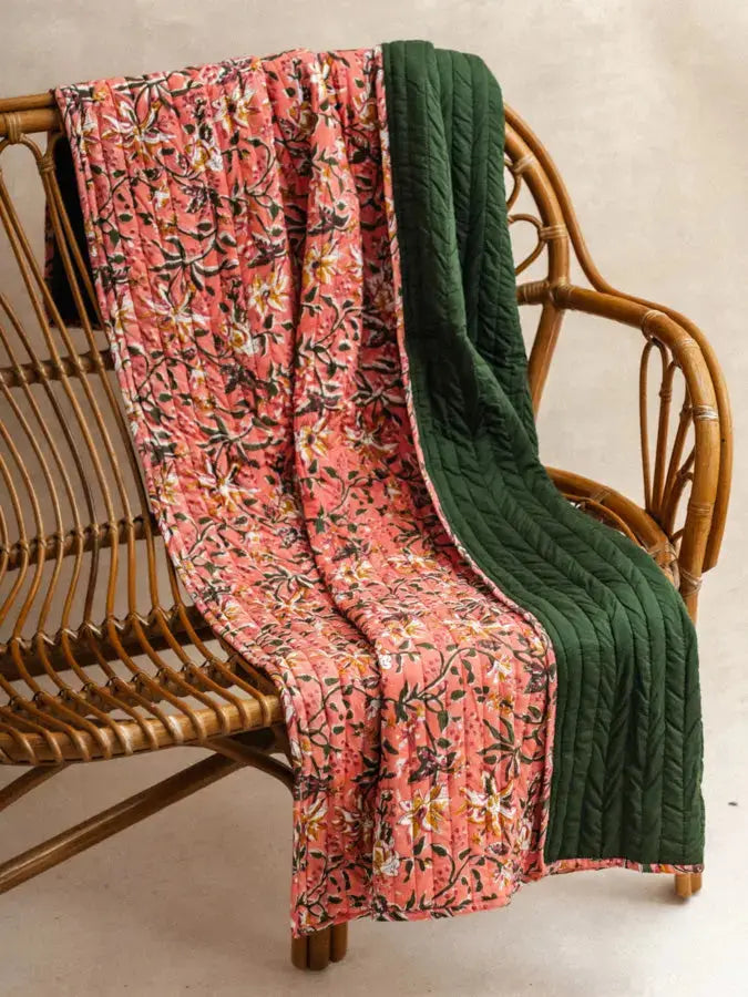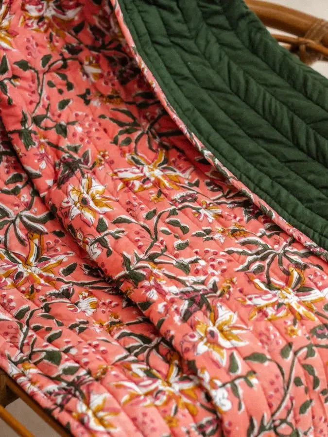 This throw blanket features a hand-printed block print on one side and a plain side. The interior is filled with batting for added softness and comfort. Carefully hand-stitched, each piece is unique, crafted in our workshop in Jaipur.