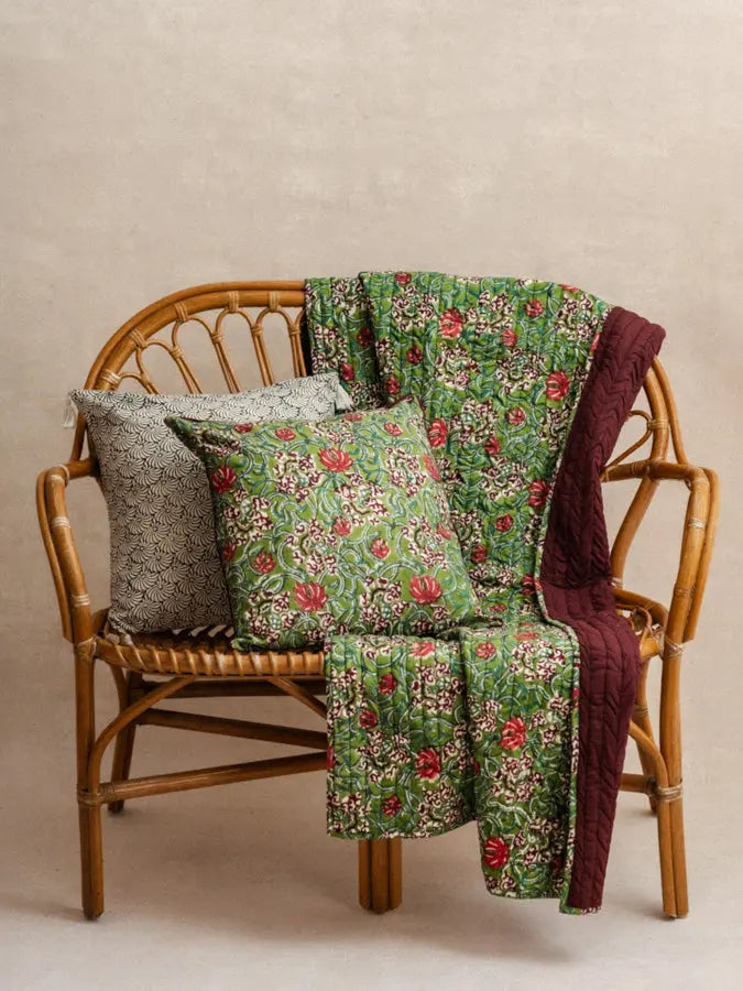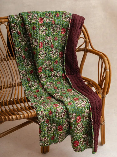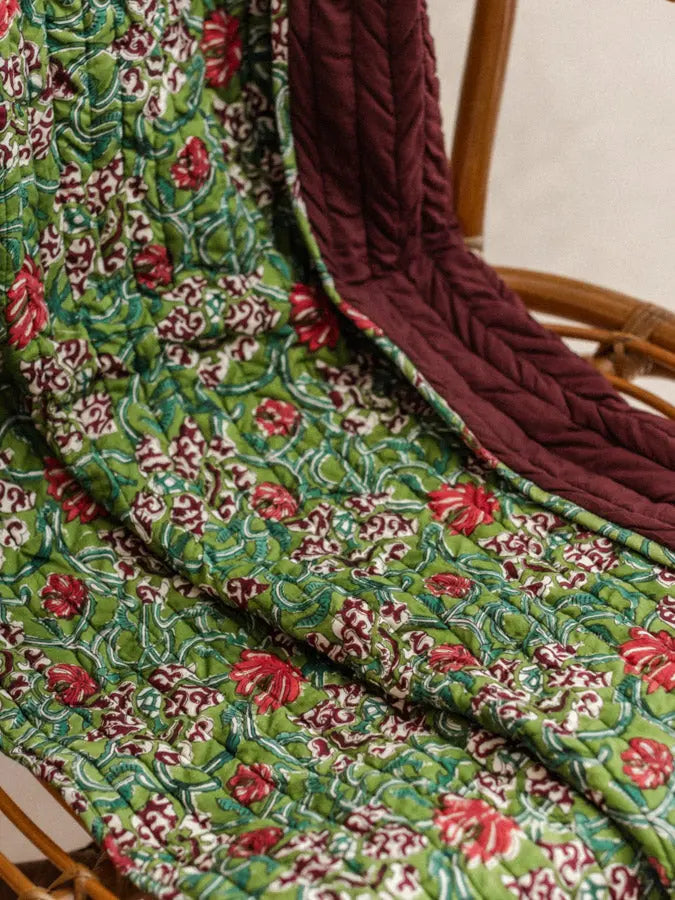 This throw blanket features a hand-printed block print on one side and a plain side. The interior is filled with batting for added softness and comfort. Carefully hand-stitched, each piece is unique, crafted in our workshop in Jaipur.