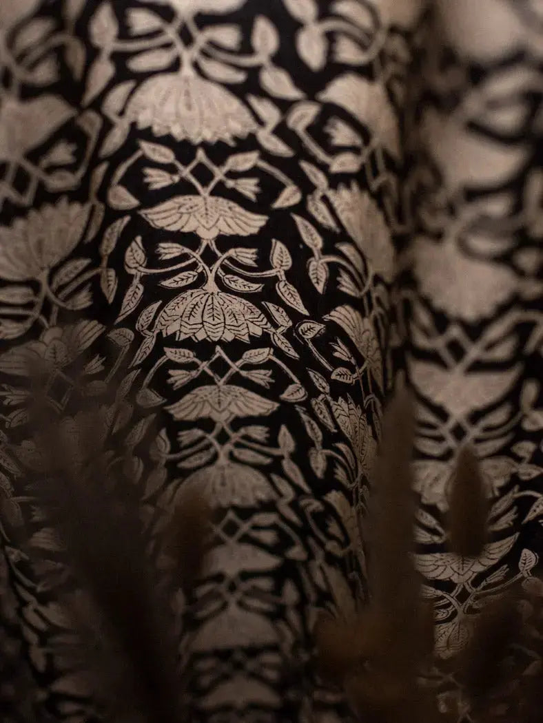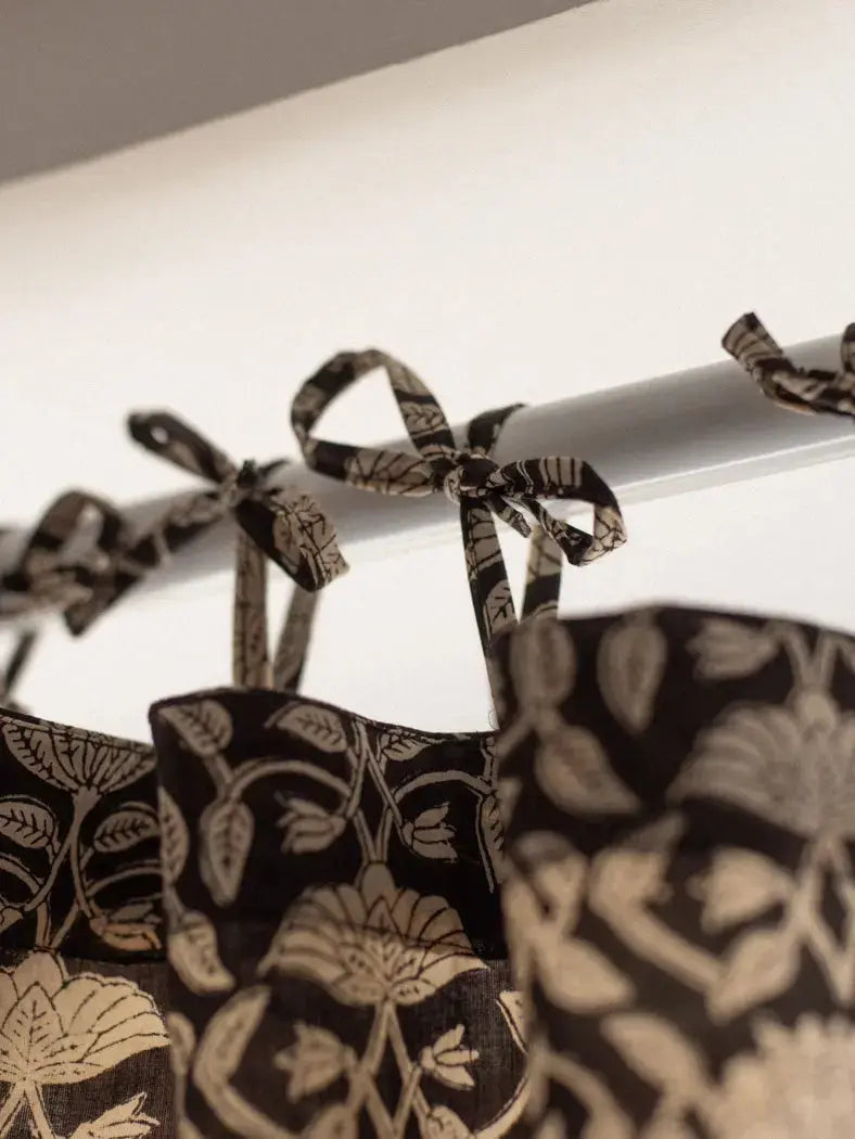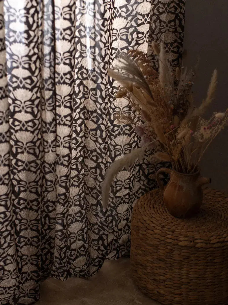 Its tie-back closure adds a refined detail to its chic design. Each curtain is a unique piece that enhances your decor. The Black Lotus pattern stands out for its graphic yet delicate character.
