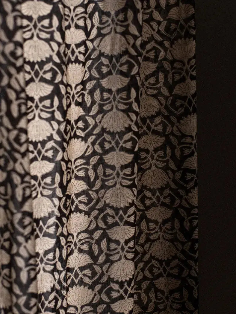 Sold individually. Size: 110 x 270cm. Black Lotus curtain with a graphic floral handcrafted print, combining tradition and modernity. Made from lightweight, airy cotton, it adds a touch of elegance to your contemporary interior.