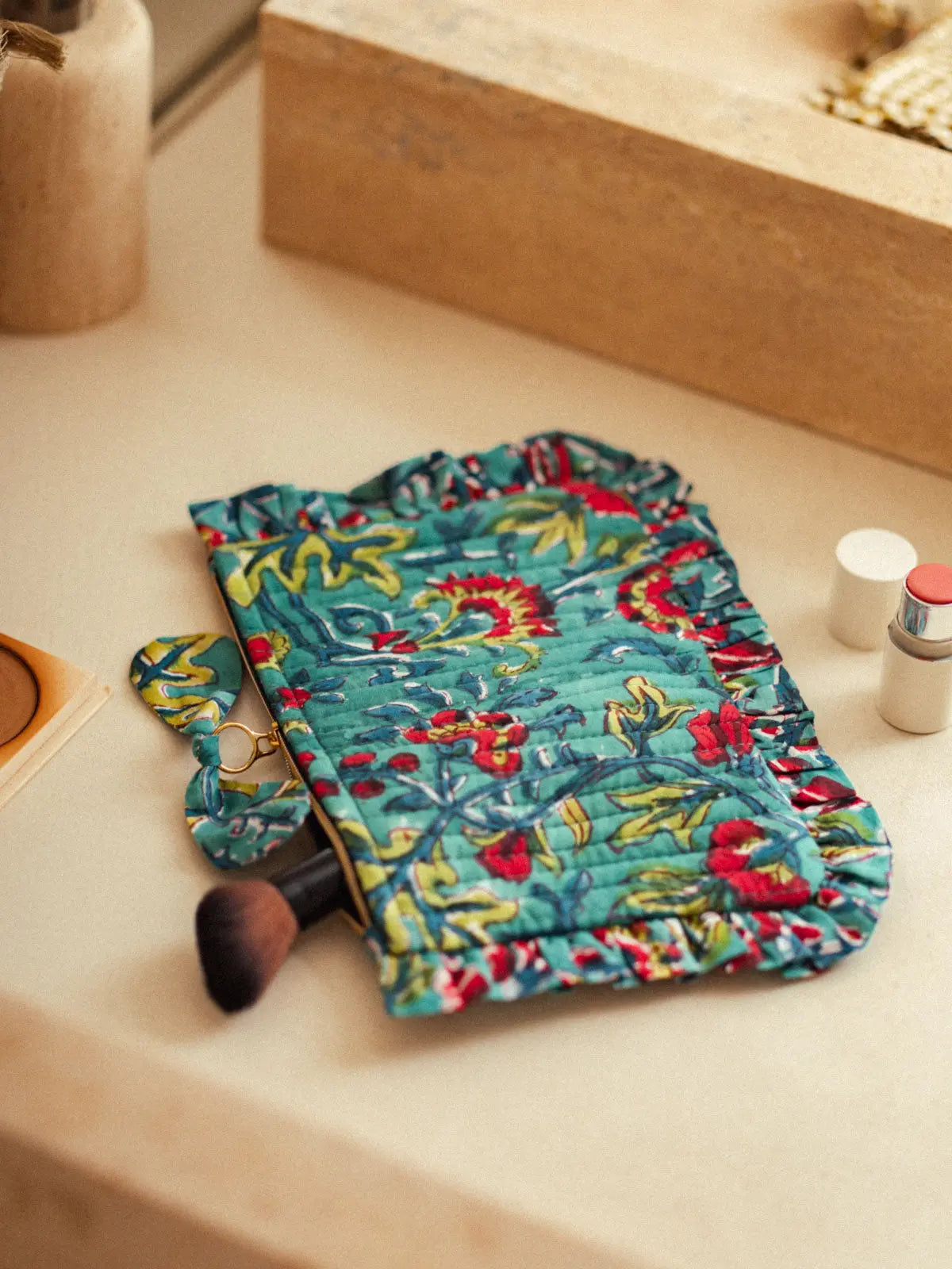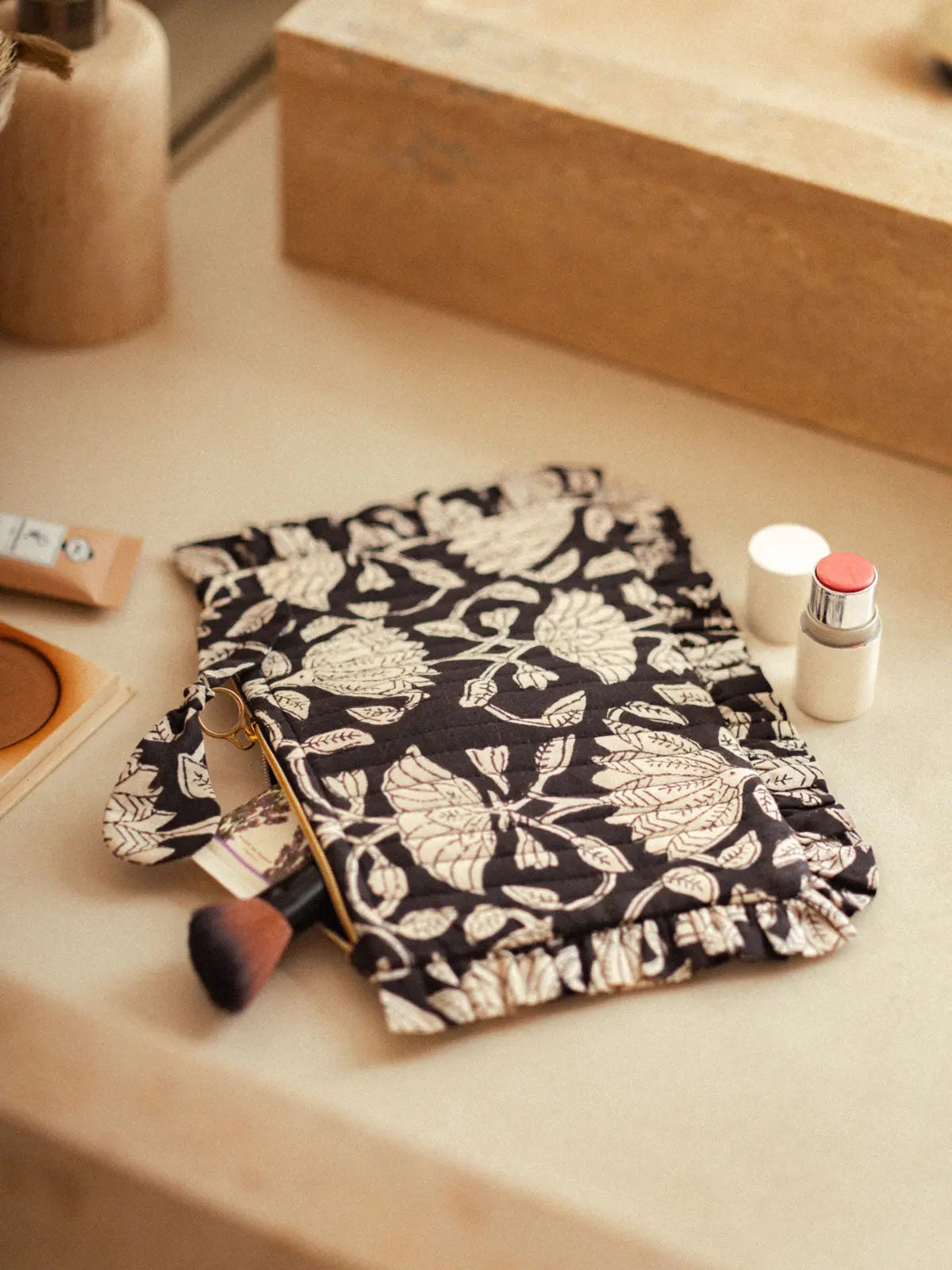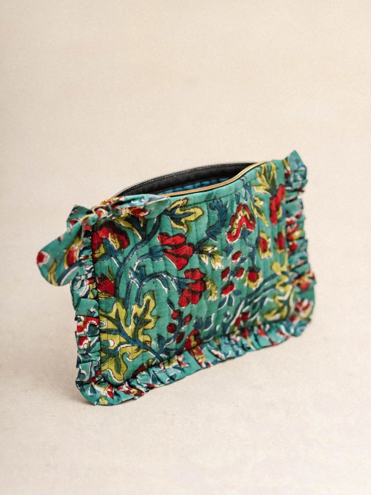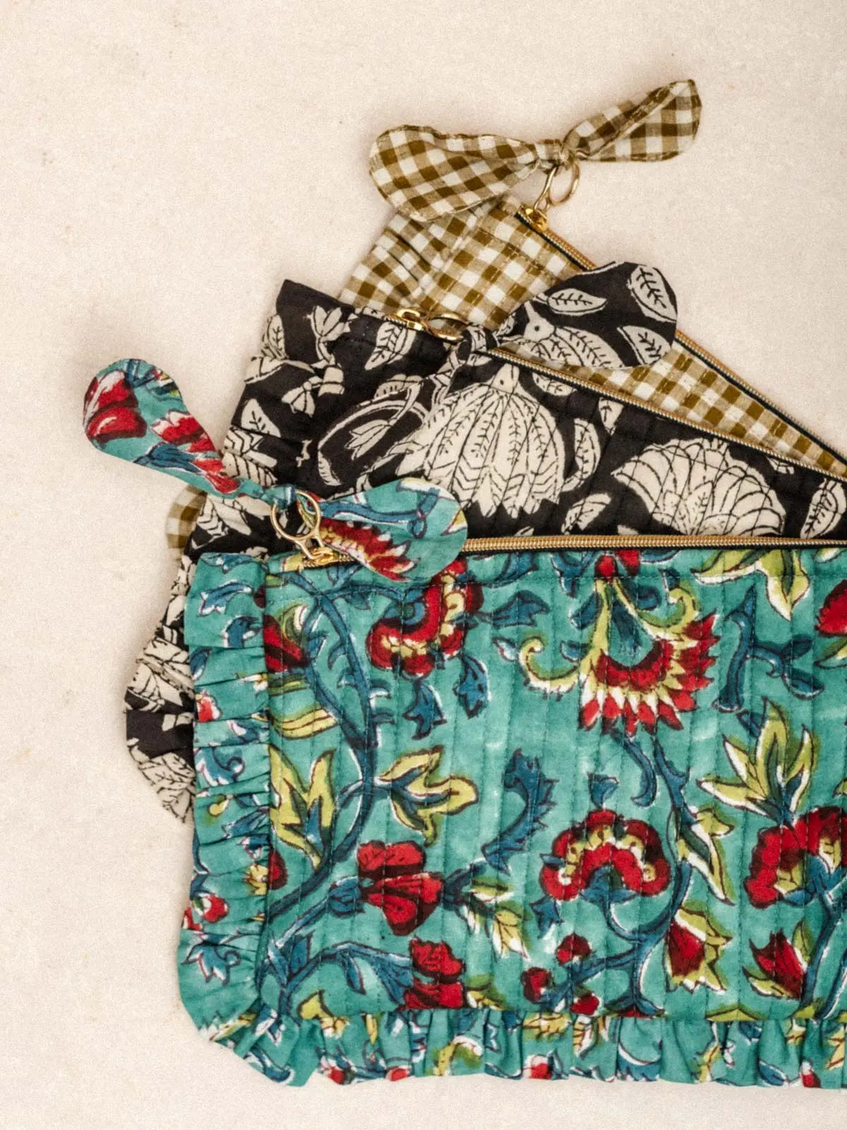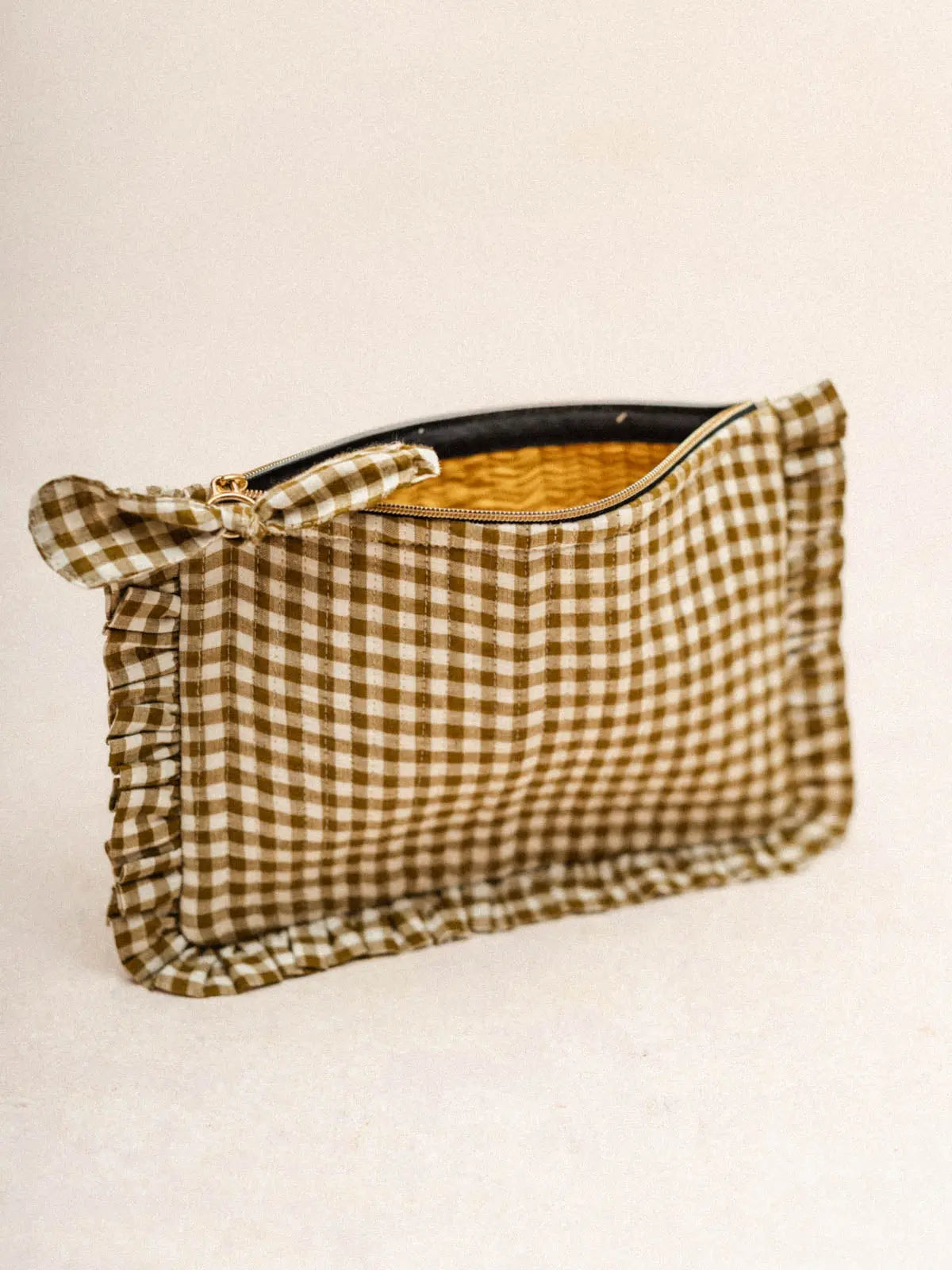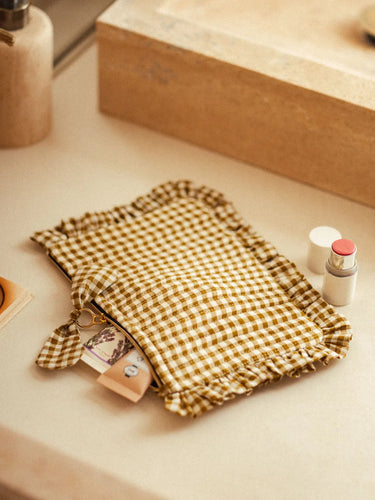 Discover our elegant and practical flat ruffled pencil cases, available in three styles: gingham, Jodhpur Blue, and Lotus Black. Crafted from velvet with delicate stitching, a ruffled finish, and a cotton lining, they combine refinement and functionality. Their compact size is ideal for organizing your essentials in style. Perfect for slipping into your larger tote bags or traveling, these pencil cases are a timeless and essential accessory.
